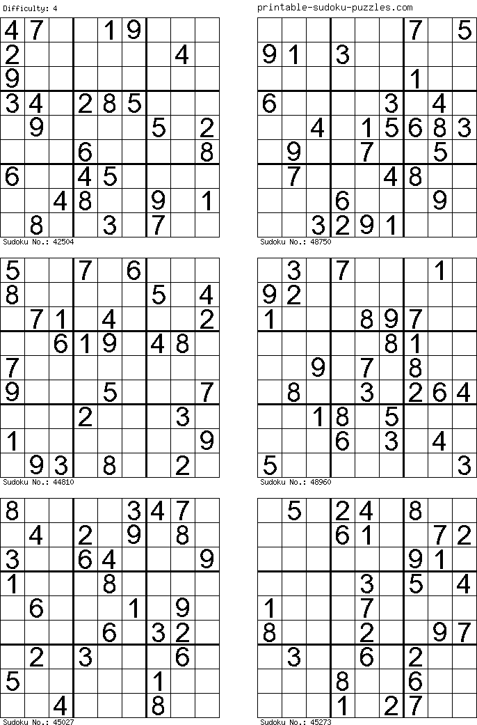Sudoku ausdrucken für alle die sudoku lieber mit papier und bleistift lösen, anstatt sudoku online am computer zu spielen oder einfach nur sudoku unterwegs rätseln möchten gibt es hier täglich neue pdfs gefüllt mit sudoku und sudoku varianten in verschiedenen schwierigkeitsgraden zum kostenlosen herunterladen und ausdrucken.